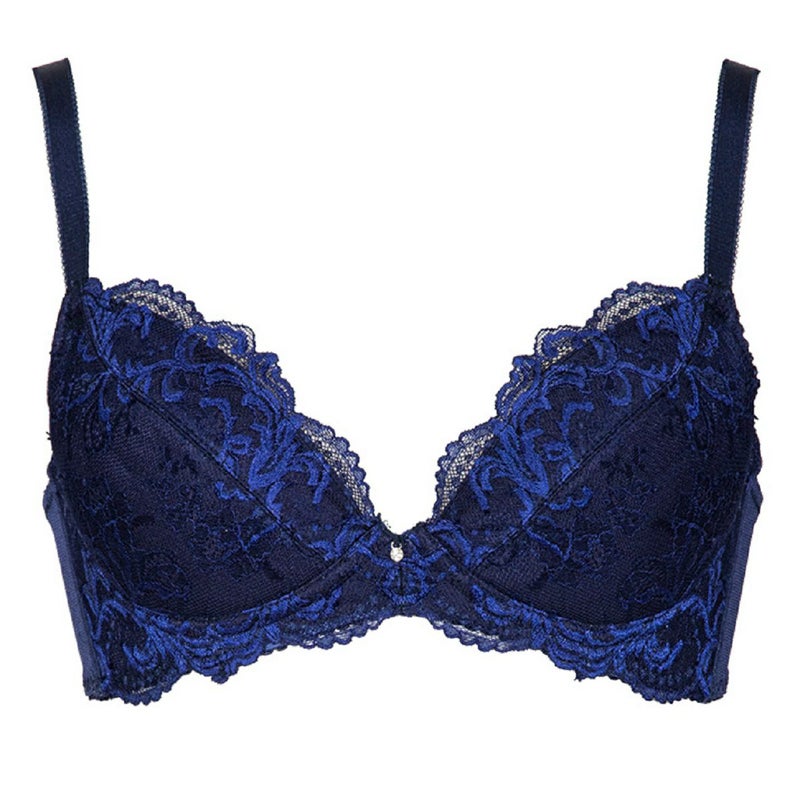 エクサブラ・モア ネイビーは独特の質感を持つレースが使用されています。 表に見える短い糸はシャーリングという手法によるデザインであり、毛玉やほつれではございません。(シャーリング:レースの柄と柄をつなぐ糸を編み込まず浮かせてカットする手法)