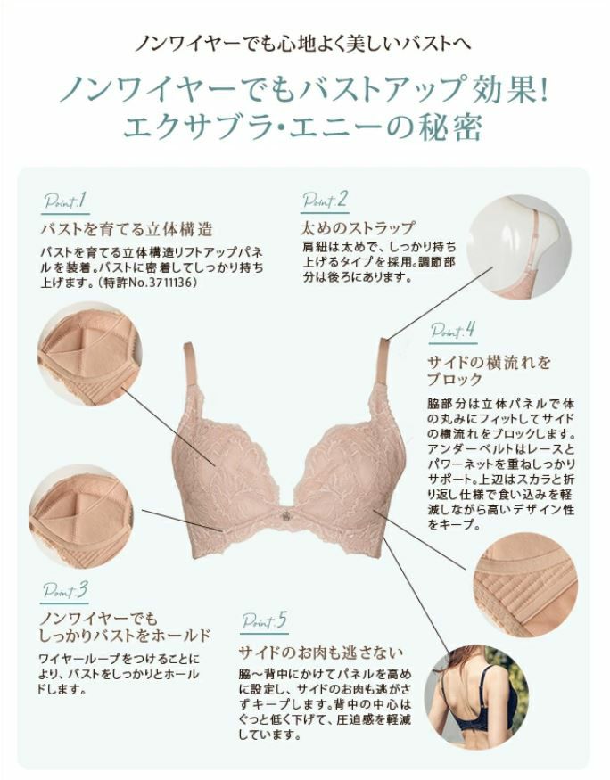 エクサブラ・エニーは、肌触りが柔らかく、ワイヤーの不快感がないので「長い移動時間も安心」というメリットも。 また、カップ内側にバストを育てる立体構造のリフトアップパネルを装着。バストに密着してしっかり持ち上げます。 脇~背中にかけてパネルを高めに設定し、サイドのお肉も逃がさずキープします。